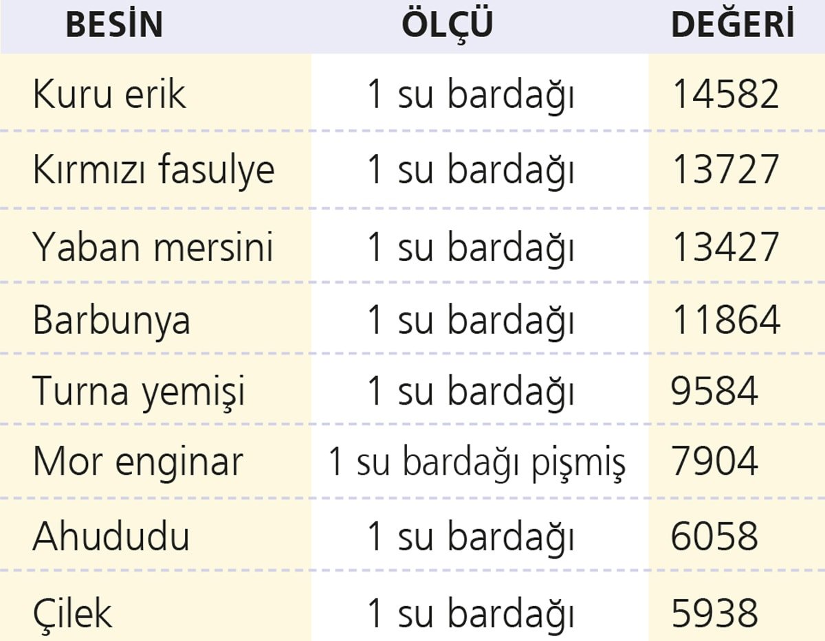 ORAC, gıdalardaki antioksidan değerine sahiptir. İşte mor besinler ve içerdikleri antioksidan ölçüleri: